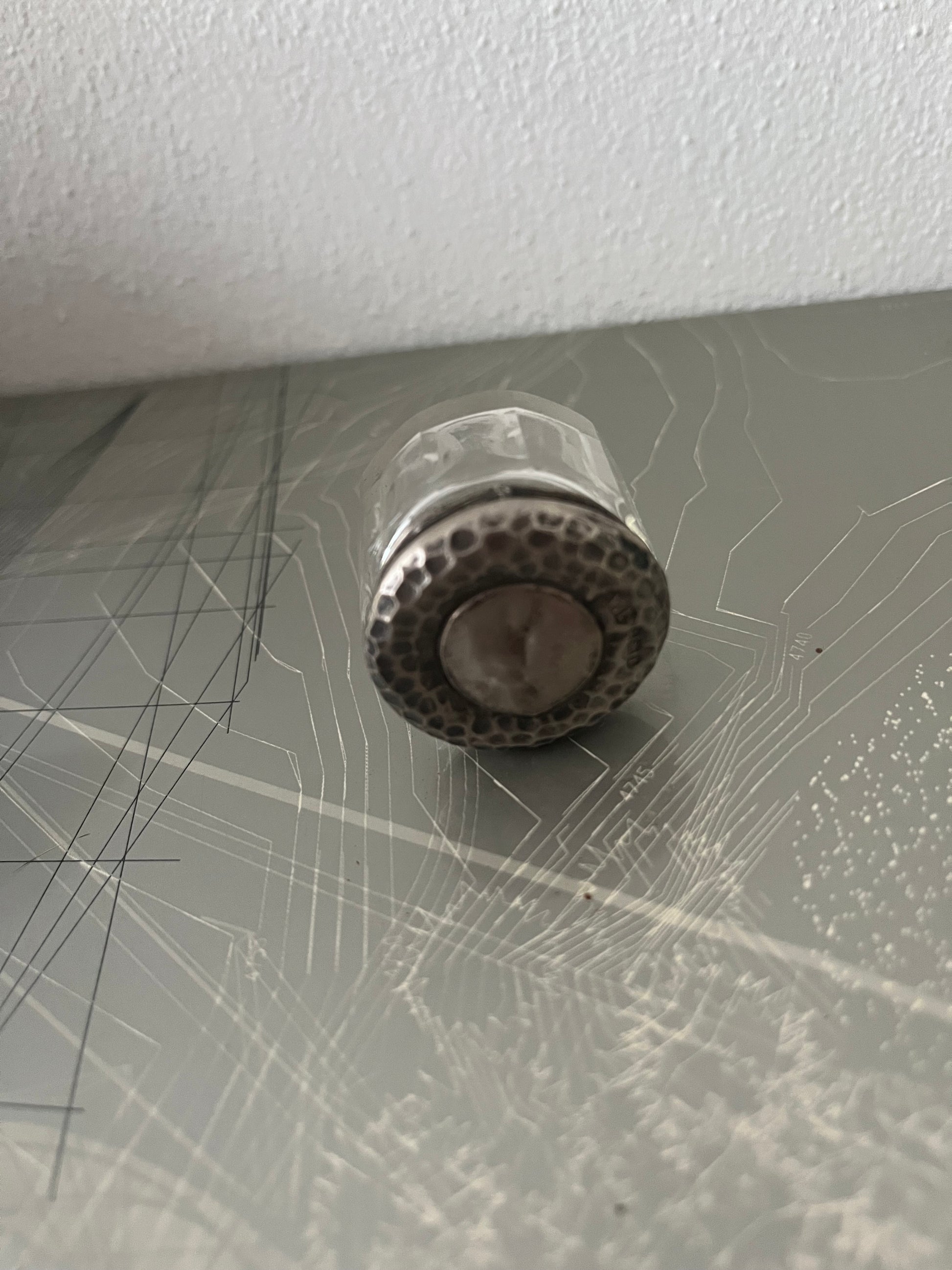 Klein antiek pillendoosje, geslepen glas met zilveren ronde bewerkte draai deksel.