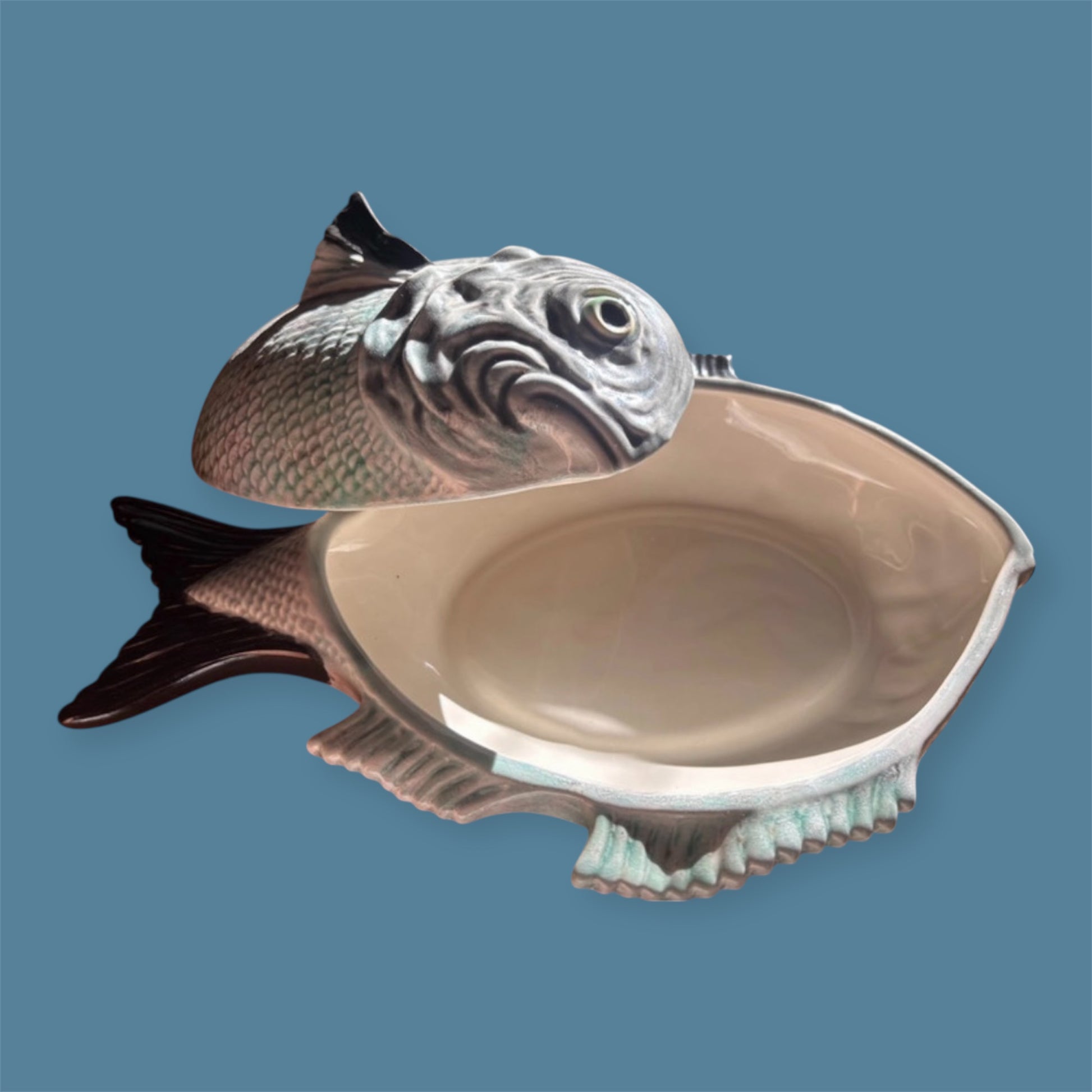 Vooroorlogse vis in geweldige staat. handbeschilderd in de pottery van Bordallo Pinheiro, die bekend werd om zijn organische keramische vormen. Gemaakt voor soep, de deksel heeft een uitsparing voor een lepel.
