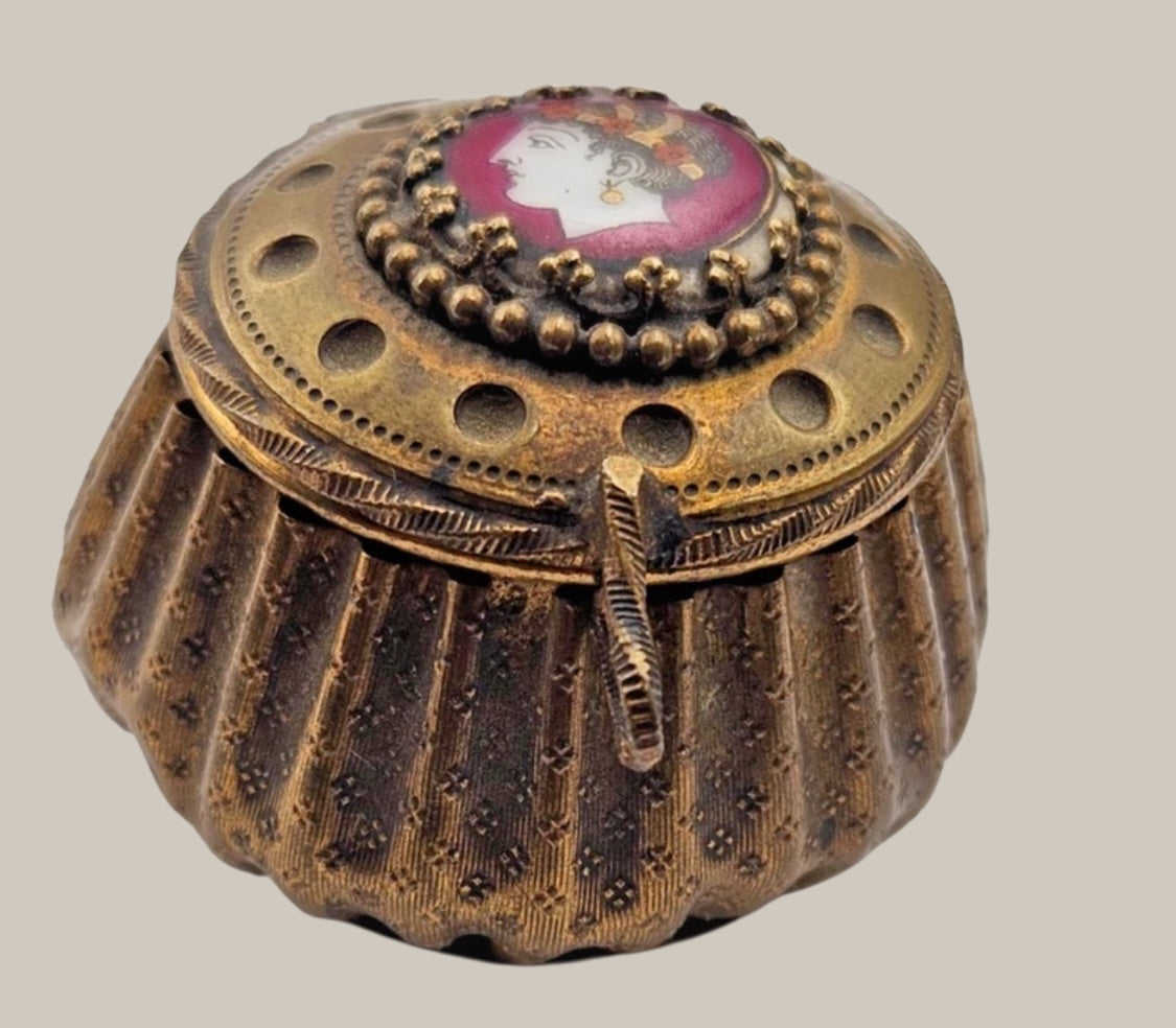 Materiaal: het doosje lijkt van messing of brons met een fraaie patina, wat wijst op ouderdom.