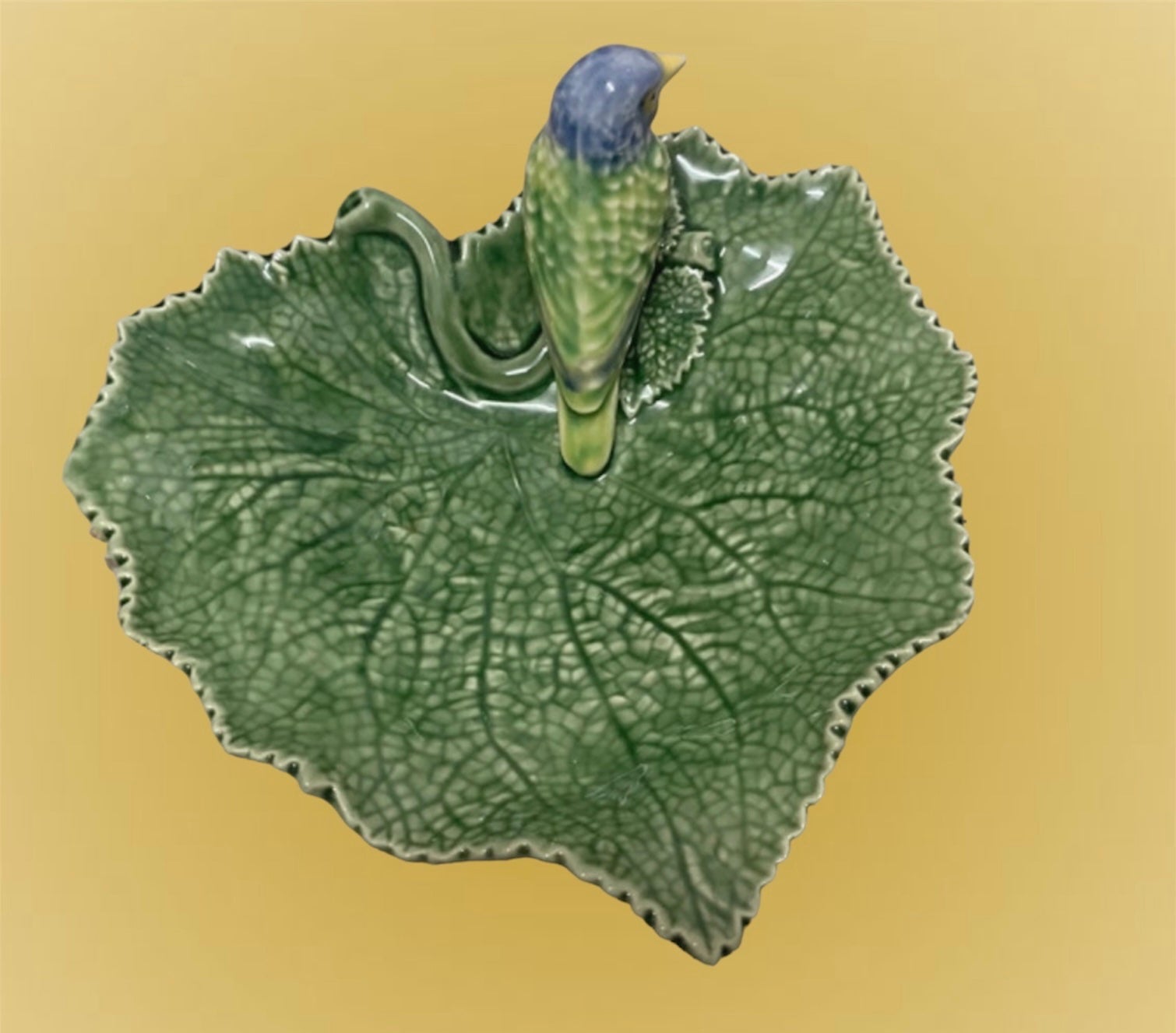 Maten: max circa 15 x 20 cm. Ook beschikbaar uit deze collectie het bladvormige schaaltje met rood en geel vogeltje.