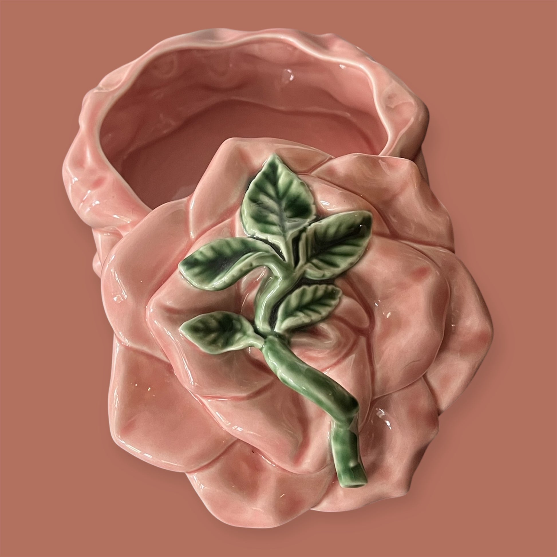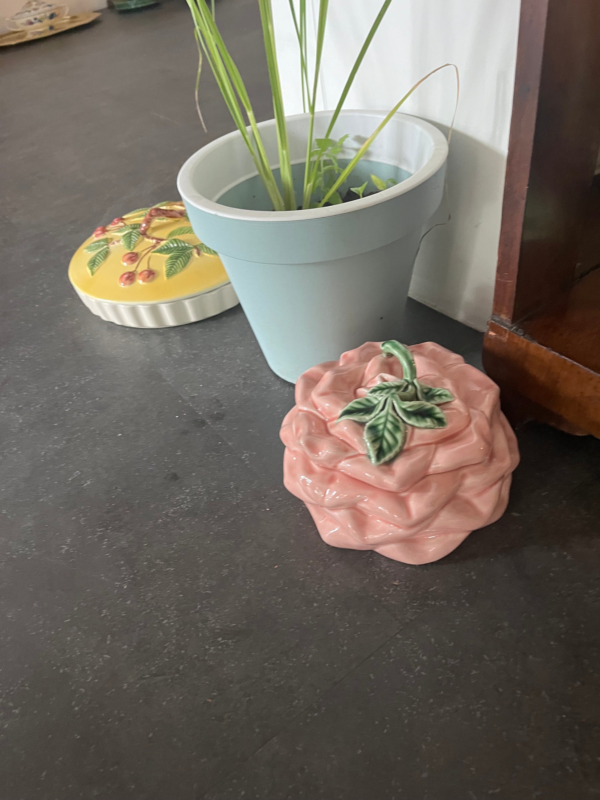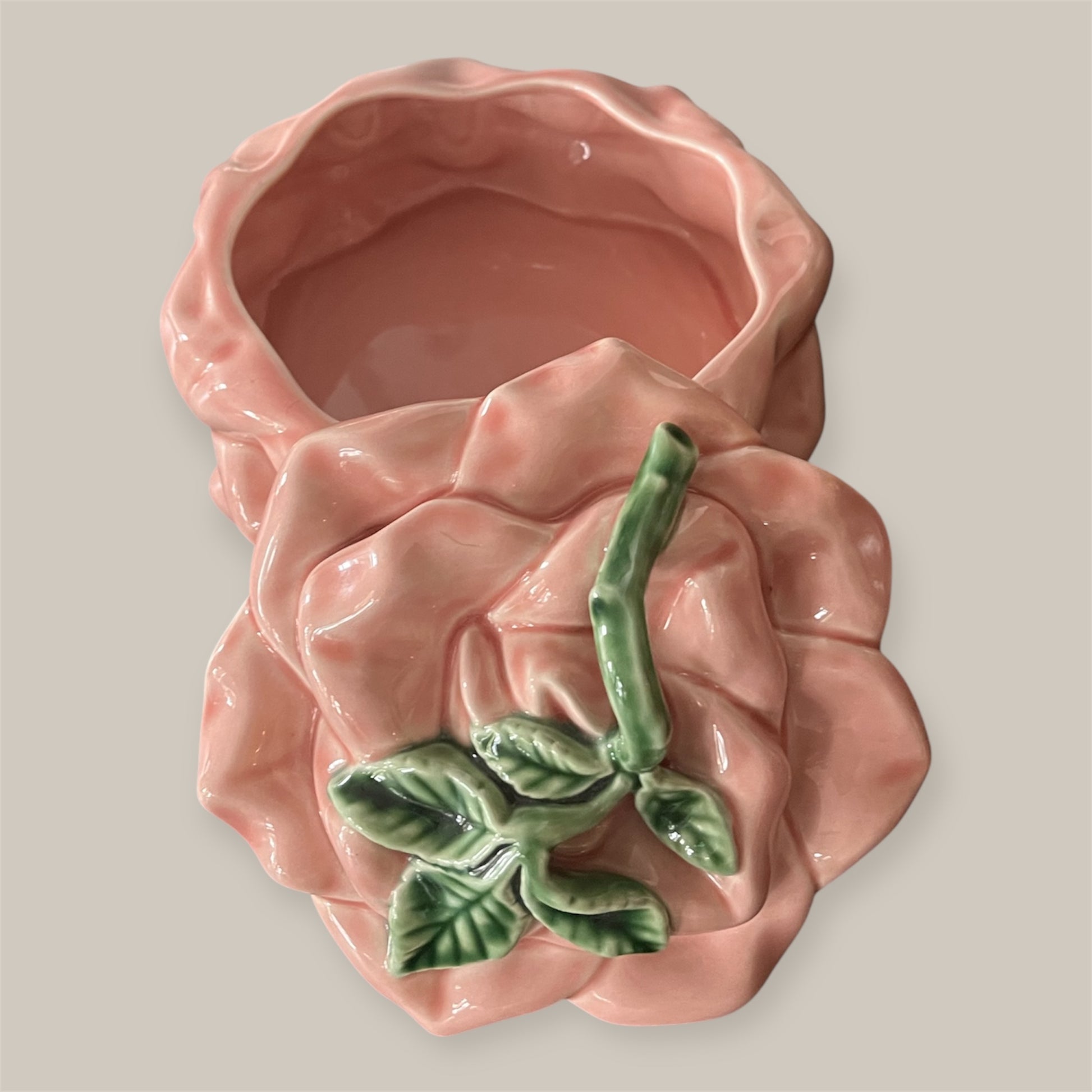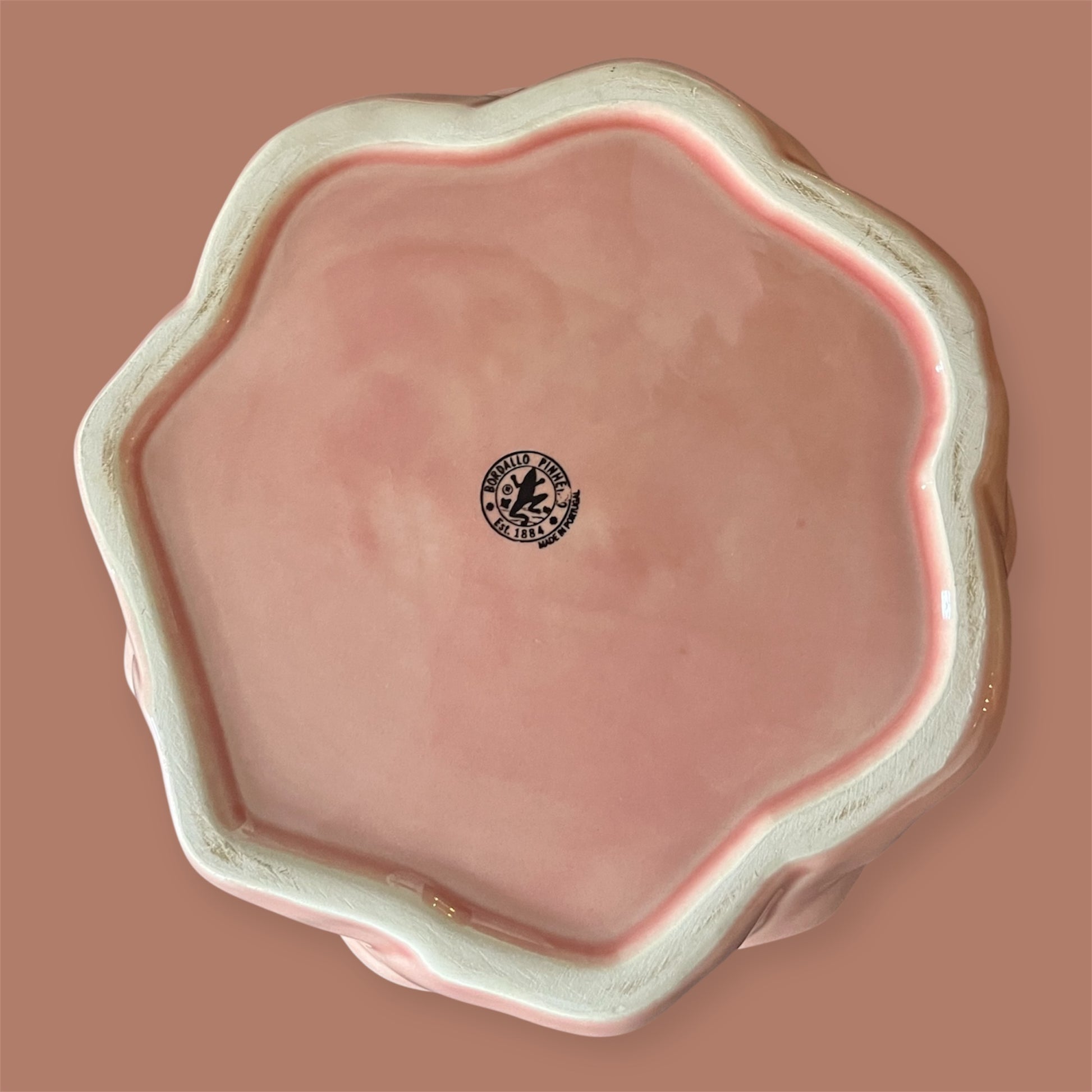 Prachtige grote roze bonbon, koekjes of snoep schaal met deksel in ongeschonden staat. Heel bijzonder gevormd. Faience uit Portugal met authentieke stempel van Bordalo Pinheiro. Collectors object.