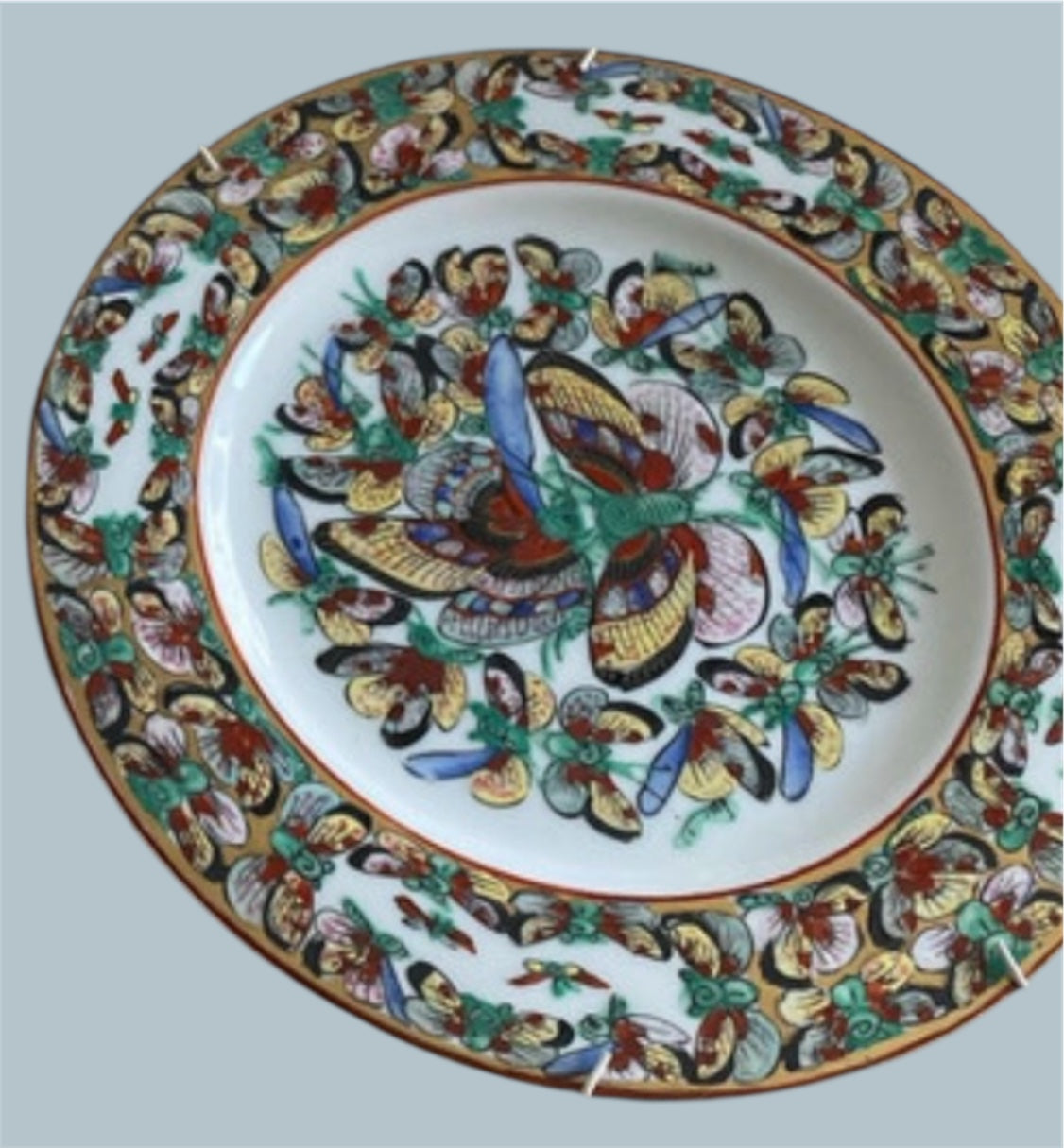 Prachtig wand sierbord met vlinder decor wat ook wel Thousand Butterflies wordt genoemd. Achterop een Chinees merkteken in rood. Circa 27 cm in diameter.