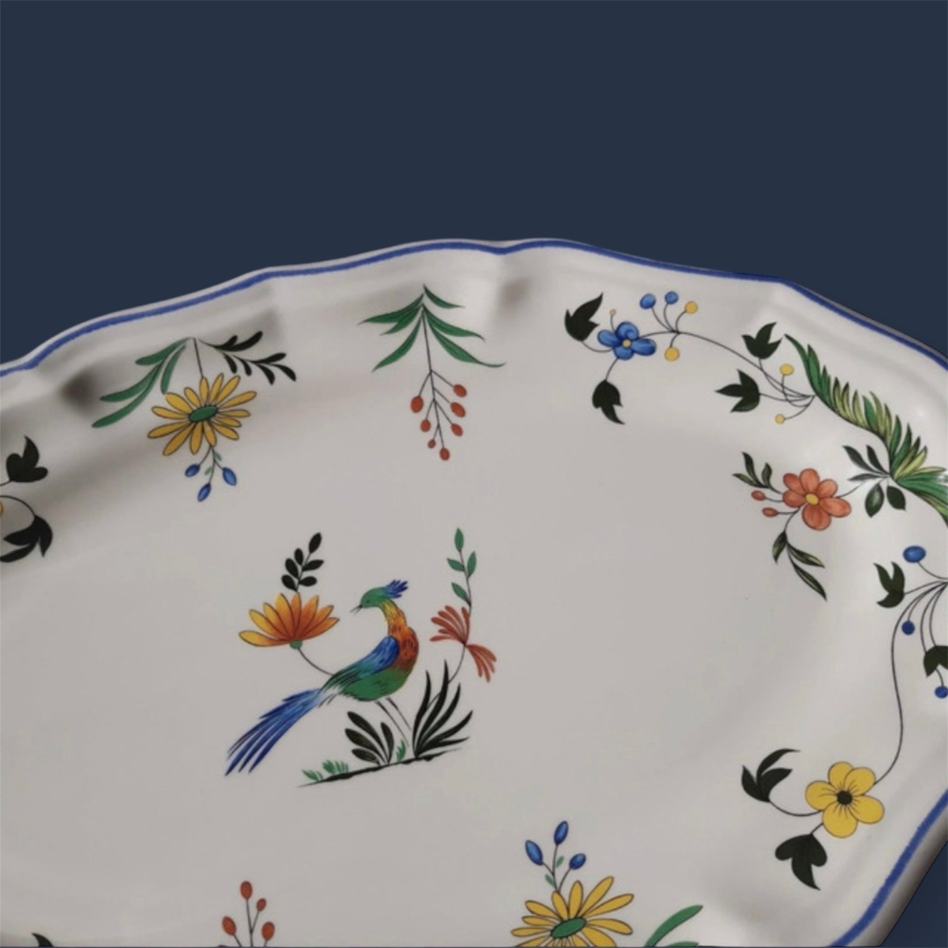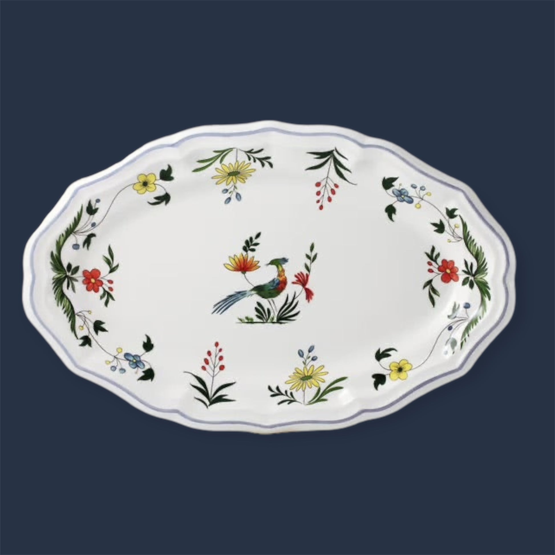 Grote ovale schaal van Faiencerie de Gien in geweldig antiek handbeschilderd decor met Paradijsvogel. In uitstekende staat. Max maten 41 x 26,2 cm. Vaatwasserbestendig. Niet geschikt voor de magnetron.
