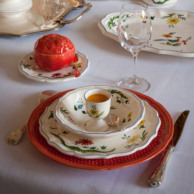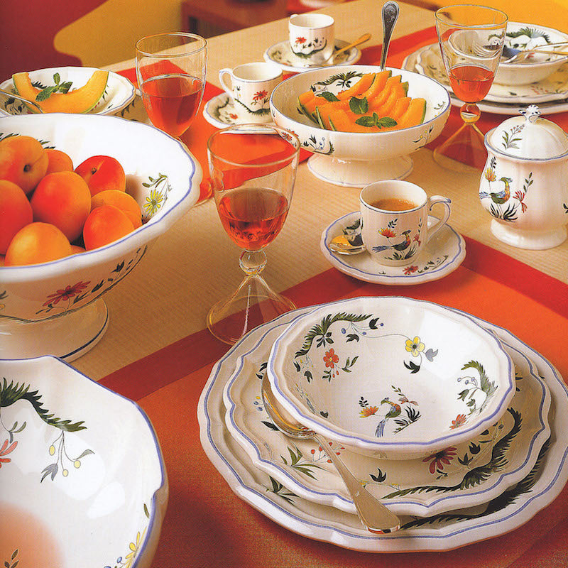 Mooi ovaal vlees zuur serveerschaaltje van Faiencerie de Gien met handbeschilderd decor Oiseaux de Paradis met max maten 26,5 × 13,2 cm. Nieuwstaat.