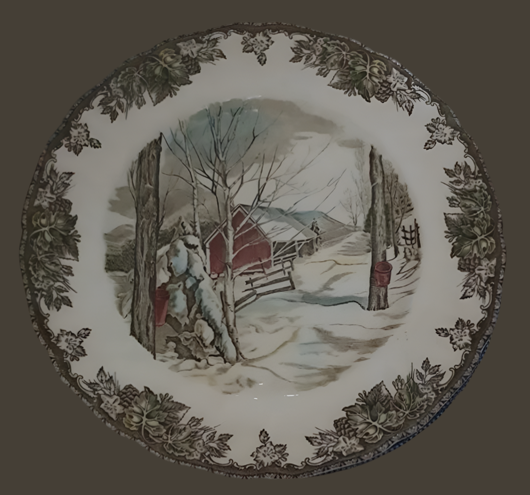 Vintage bord van Johnson Brothers uit de The Friendly Village serie. Voorstelling van een winterlandschap met een rode schuur. Gemaakt in Engeland. Perfect voor verzamelaars of als decoratie. Leuke decoratie voor Kerst. ππ π»