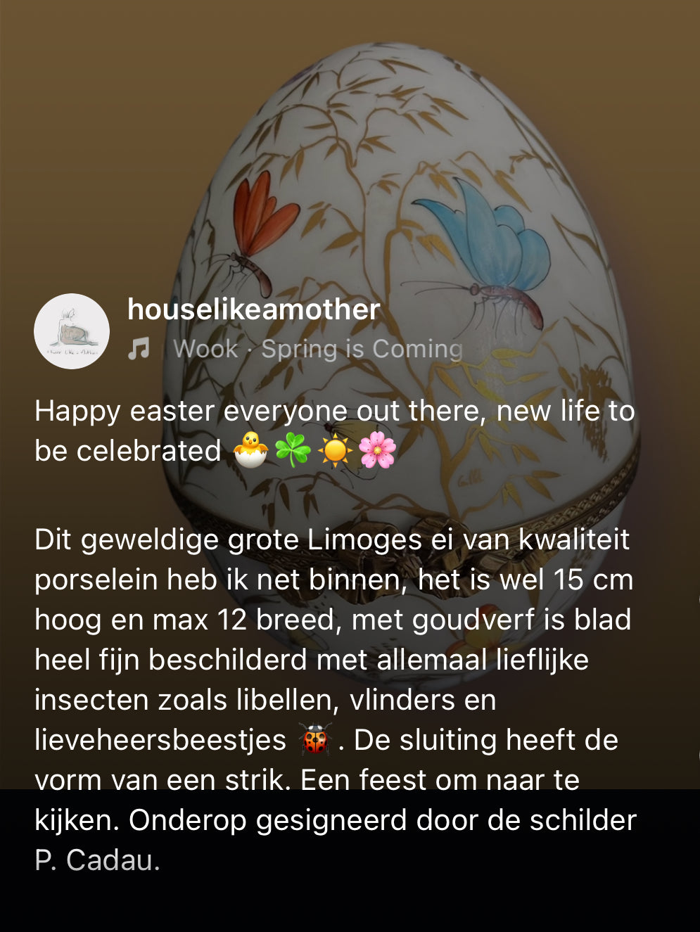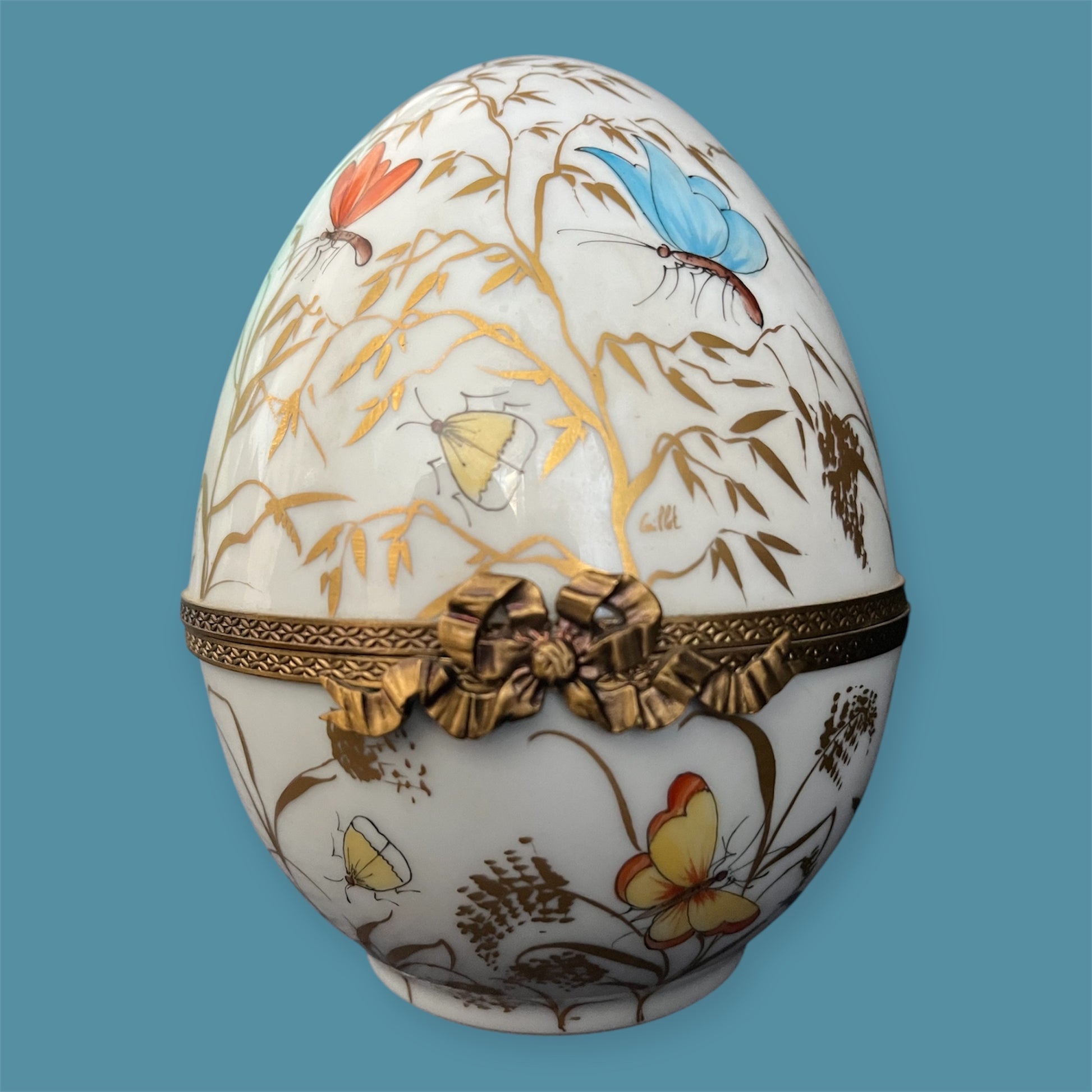 Groot formaat 16 x 12 cm Limoges ei. Prachtig fijn handbeschilderd met goud en versierd met mooie insecten. De sluiting heeft de vorm van een strik.