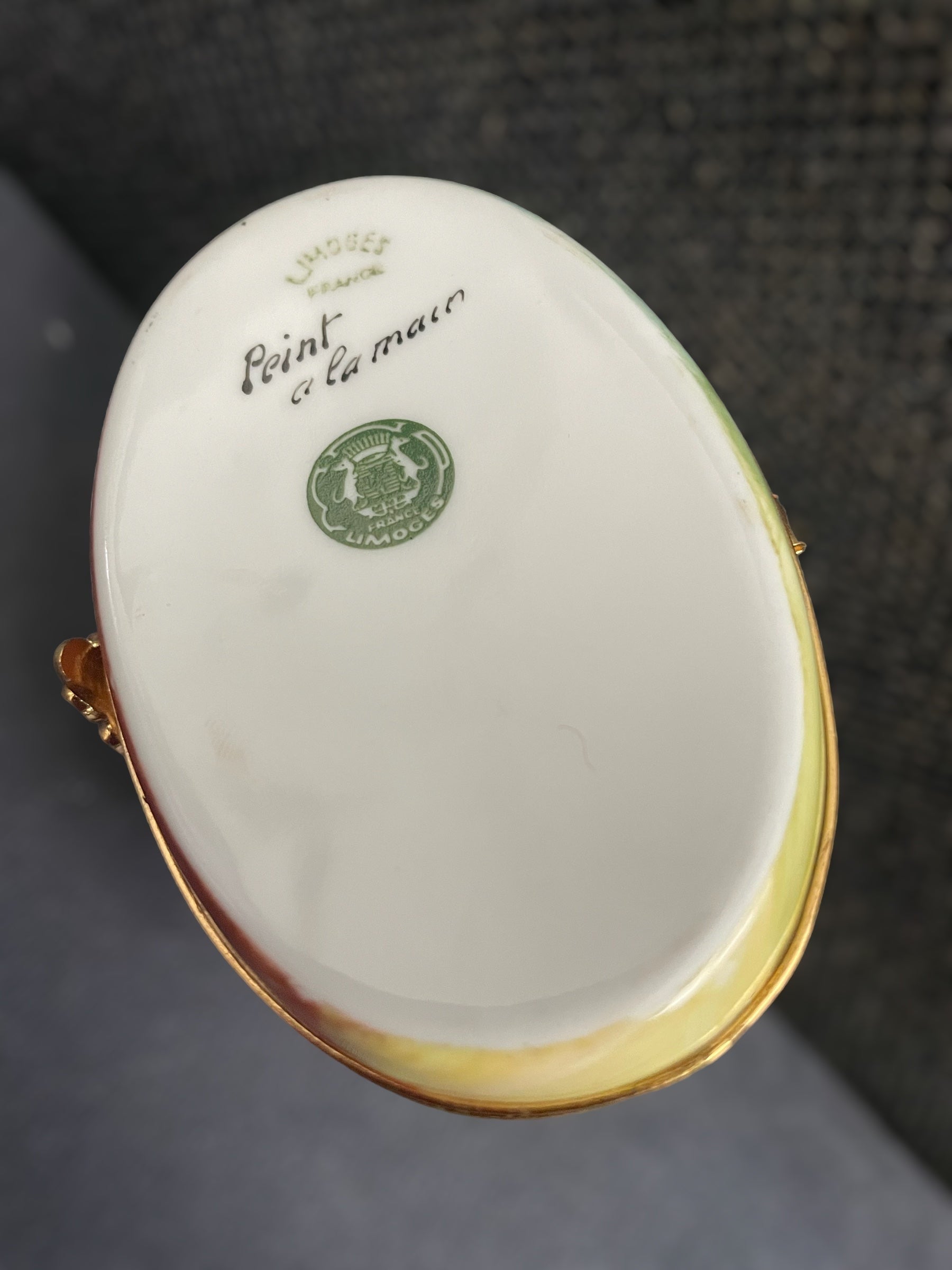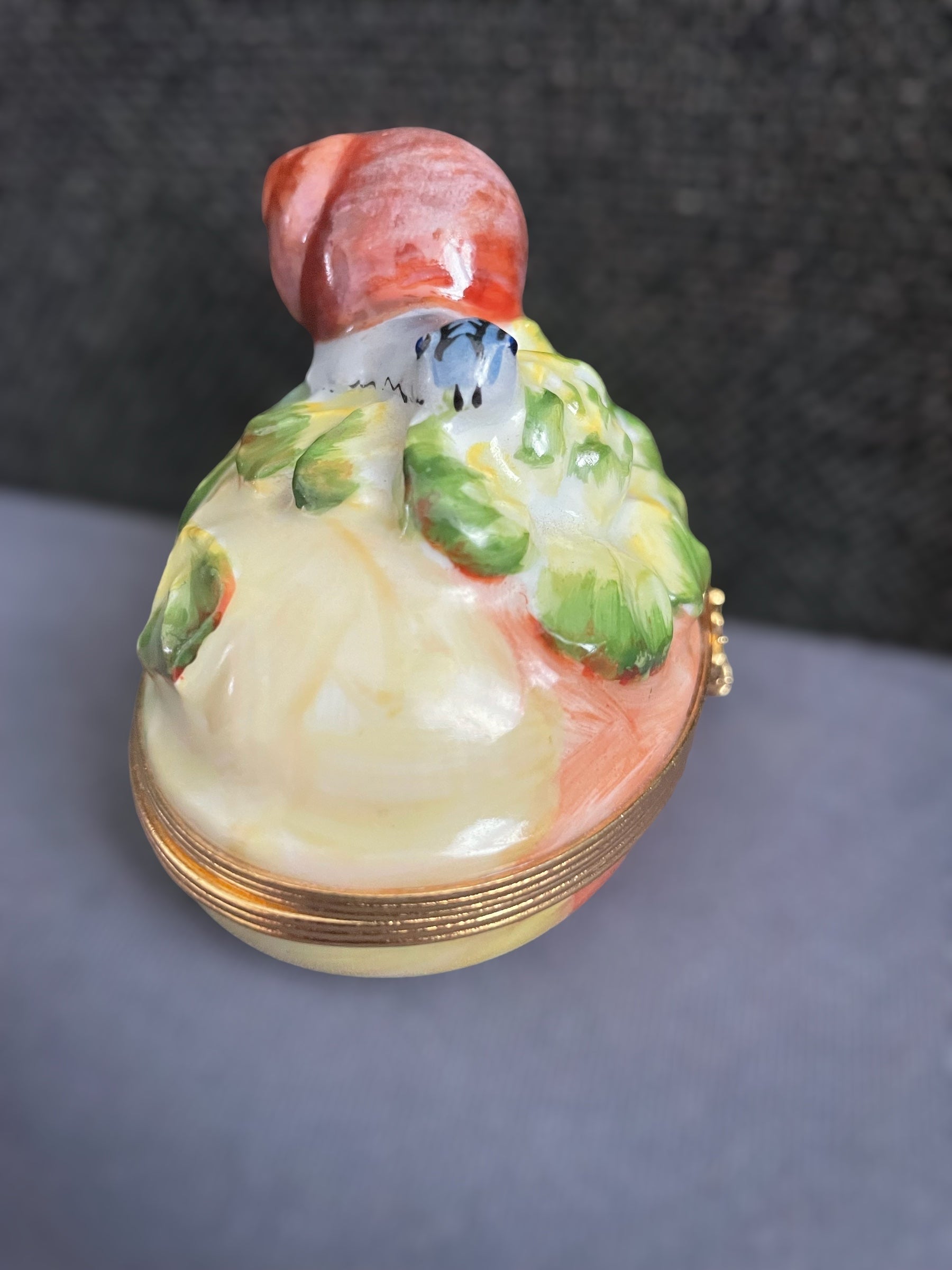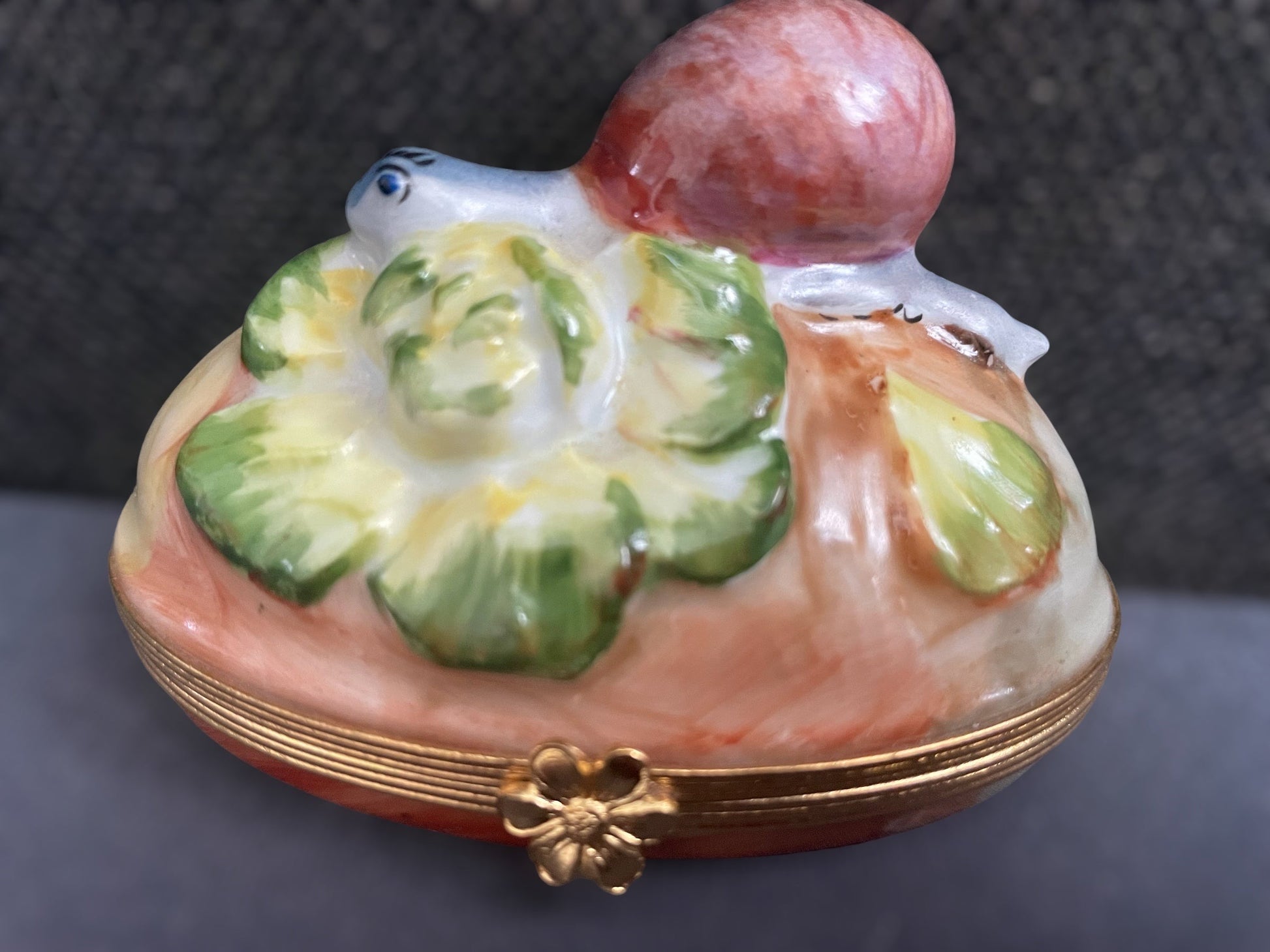 Mooie vintage handbeschilderd doosje met een slak er bovenop. Verkeert in geweldige staat. Ook binnenin een kleine beschildering en onderop gemerkt.