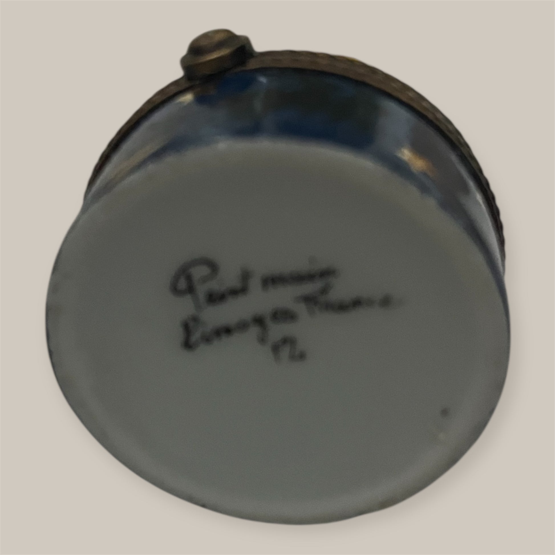 Mooie kerstdecoratie om kado te geven of als gezellig detail in uw kerst versiering waar dan ook in huis. De basis is hemelblauw met gouden sterren erop geschilderd met binnenin een schattig kadootje afgebeeld. De sluiting is een rond balletje. De boom heeft reliëf en is versierd met rode en gele slingers en sterren. De piek is een grote gele ster. Onderop gemerkt en hand geschreven Limoges France Peint main.