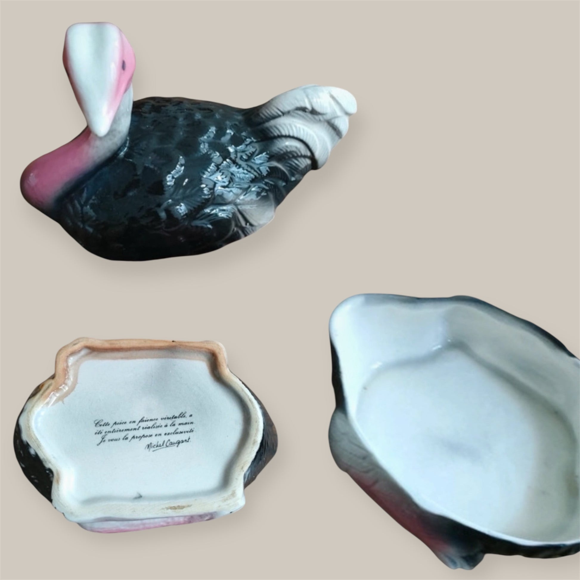 Struisvogel terrine uit de jaren zesting in roze, zwart en wit handbeschilderd. Het interieur is schoon. Enige belijning zichtbaar. Het bodemdeel is onderop gemerkt met een stempel.