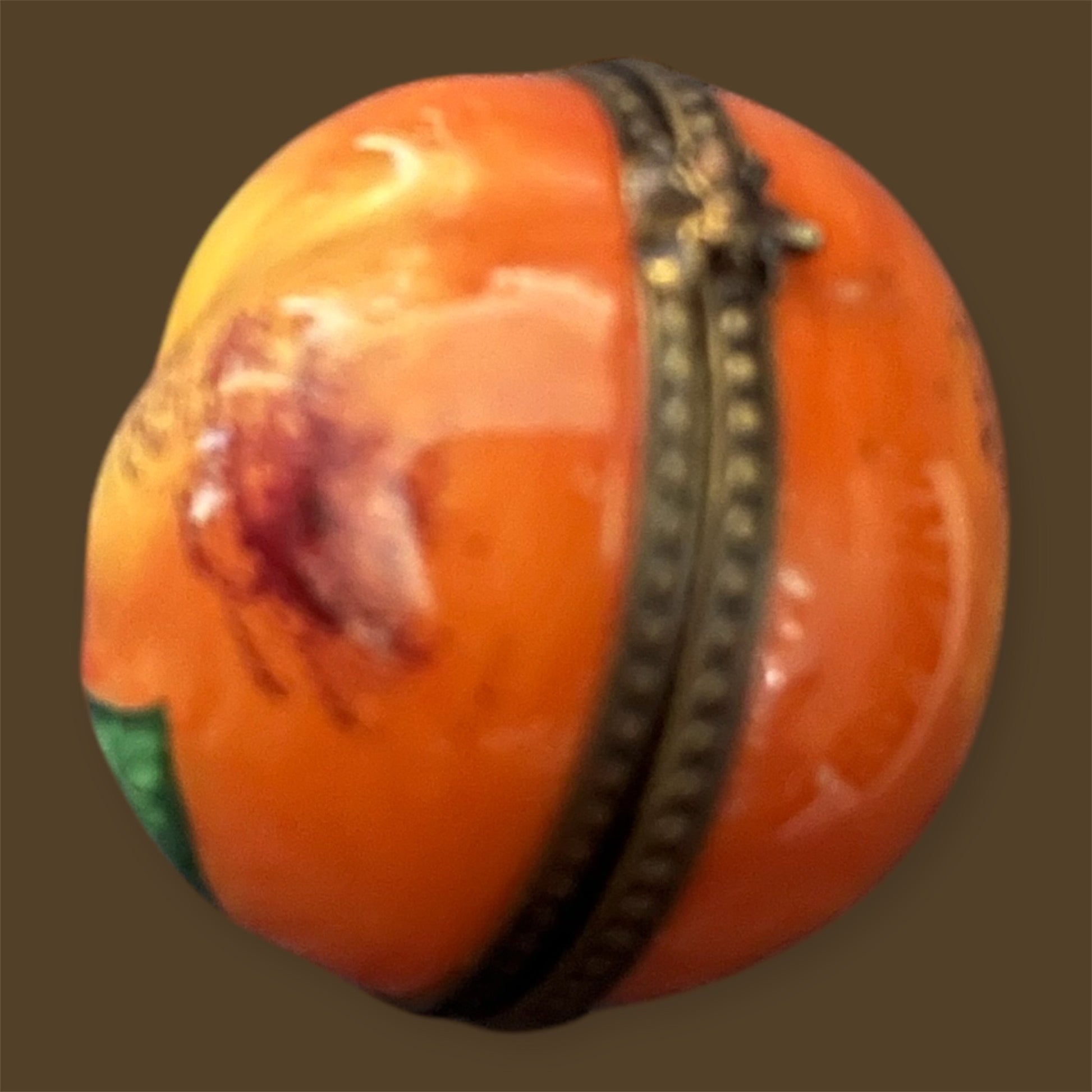 Te schattig antiek frans porselein pillendoosje in de vorm van een abrikoos. De sluiting is een steeltje. Mooi oranje handbeschilderd en versierd met groen blad.