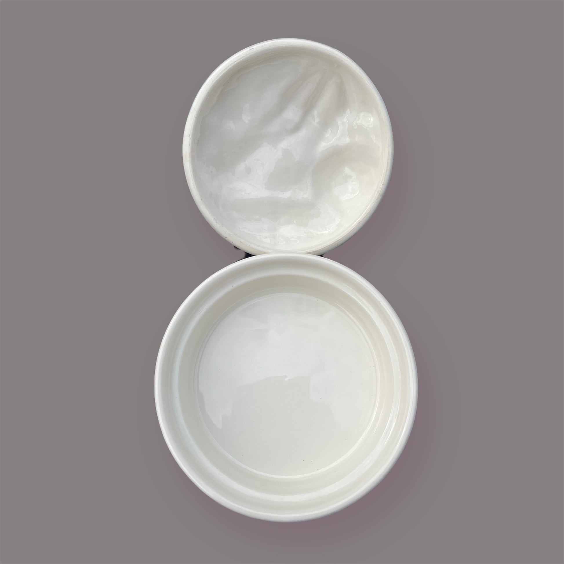 Een zeldzame vintage ronde terrine uit Frankrijk. Netjes en schoon van binnen. De deksel is rijkelijk versierd met groenten waaronder een bloemkool en asperges met een strik en bovenop een tomaat in barbotine. Onderop het bodemdeel gemerkt met stempel. Afmetingen: diameter van 15 cm en 8 cm hoog.