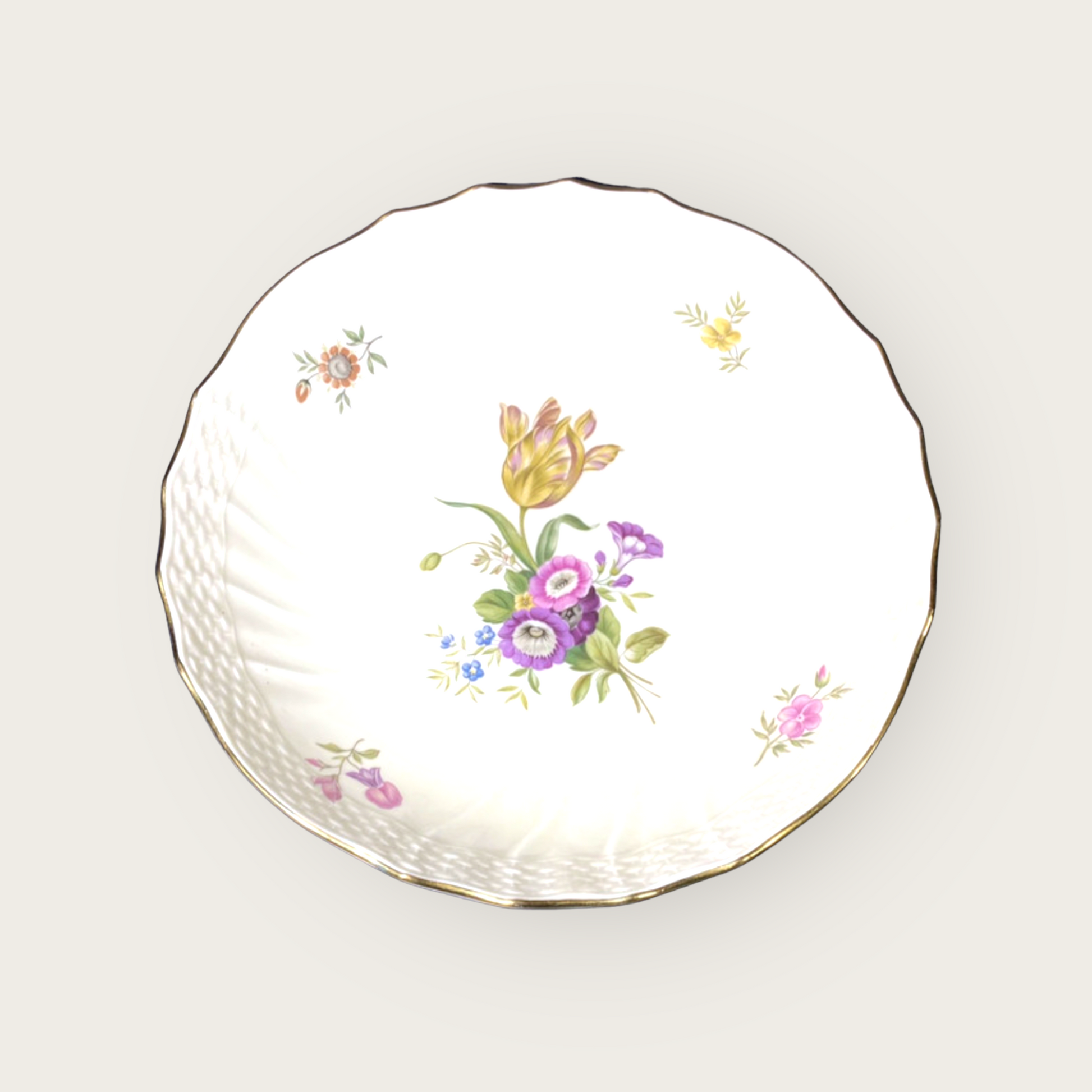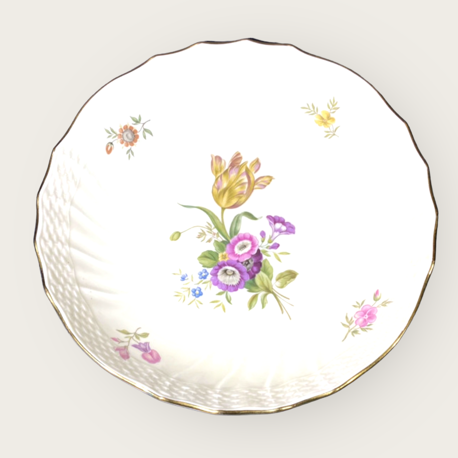 Prachtige vintage schaal met een diameter van 21 cm. Relief aan binnen zijde en een heel mooi floral decor. Goud gerand. In geweldige vintage staat.