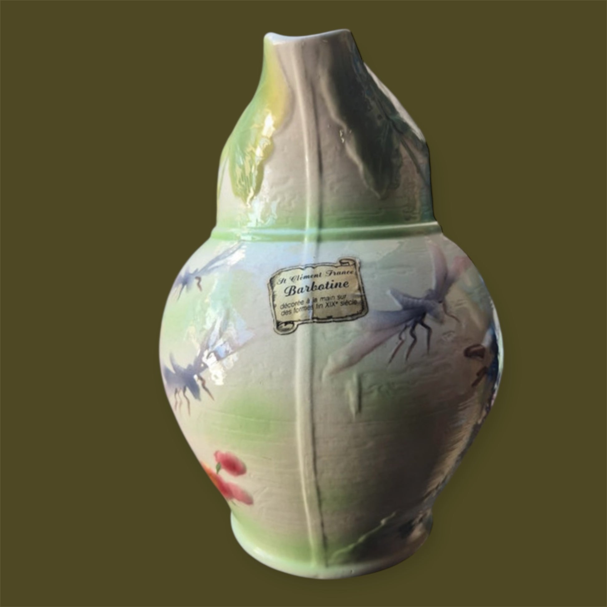 Art Deco periode handbeschilderd barbotine eenden, insecten en bloemen en bladeren decor. Circa 27 cm. hoog. Gestickerd. Naar voorbeeld van 19de eeuw.