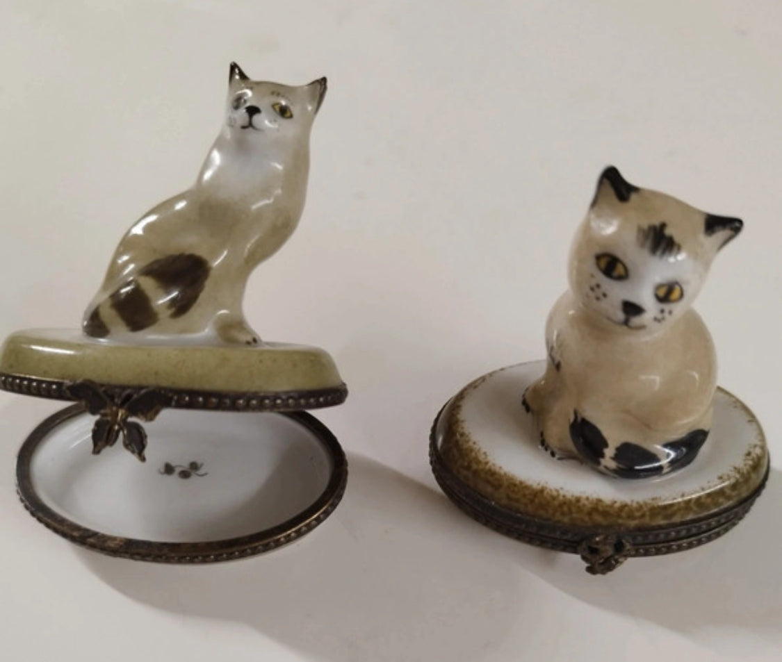 Siamese tweeling kat. Set van twee snuisterijen doosjes van Limoges porselein met de hand beschilderd.