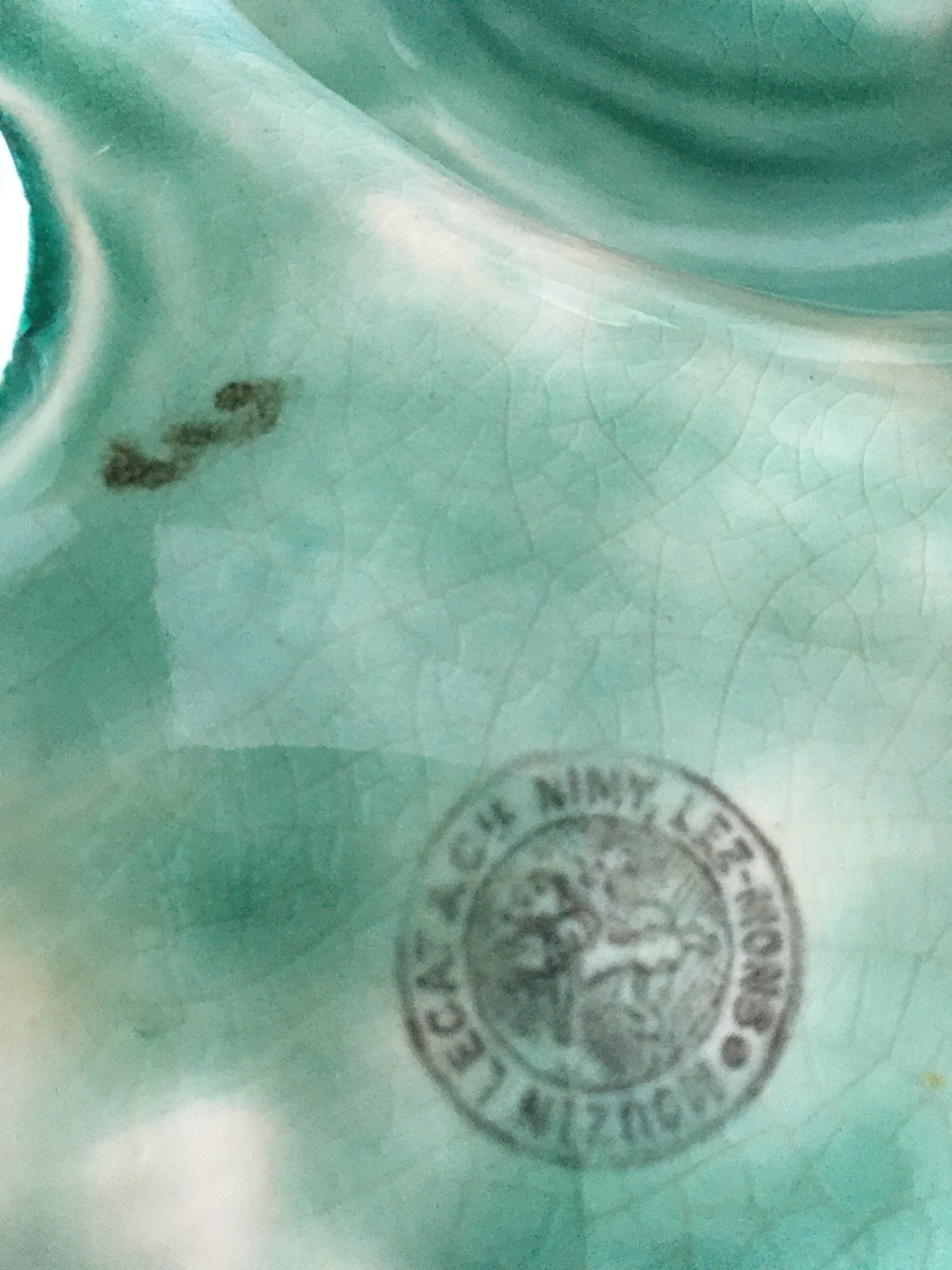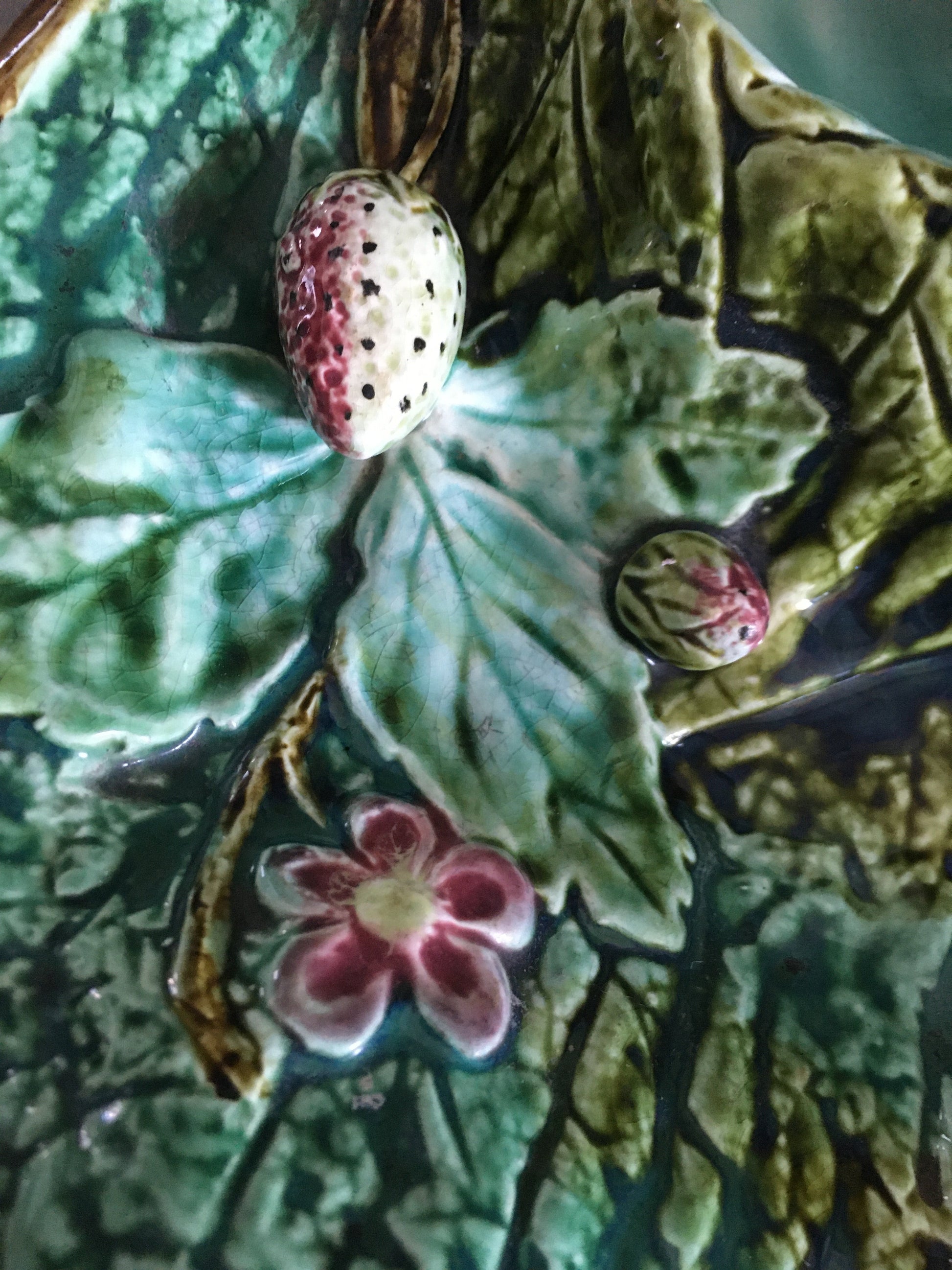 Geweldig Noord-franse majolica aardbei serveer schaal in relief, rond 1900, gestempeld op onderzijde en genummerd 3. In hele mooie antieke staat. Enige tekenen van ouderdom zoals wat lijntjes in de turquoise ronding en een stukje glazuur van opbouw met blad, weinig storend, zie detail foto's.